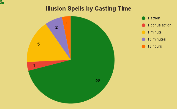 71% of Illusion spells have a casting time of 1 action. 1 minute, at 16%, is the next most common casting time.